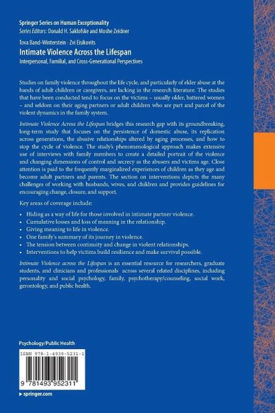 The relatively intense preoccupation with elder abuse in the gerontological literature in recent years has not specifically addressed long-term intimate violence among the old adults and its lasting consequences. Similarly, the literature on intimate intergenerational relationships in old age has usually focused on normative exchanges between partners and their extended family, including their adult children. Therefore, conflictive relationships, and particularly violent ones, have also fallen outside the scope of this body of research. This volume describes and analyzes the various perspectives of family members concerning life, and particularly old age, in the shadow of long-term intimate violence. It explores how people make sense out of living and aging in violence, how interpersonal, familial and cross-generational relationships are perceived and reconstructed and how "we-ness" is achieved, if at all, in such families.