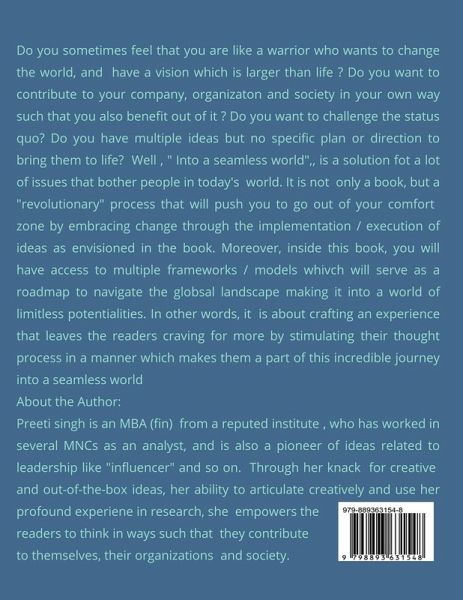 "Into a seamless world" is a unique book which is engaging, captivating, evocative, encapsulating and educational, being one of its kind. It presents the new paradigms of the different critical issues across the globe in the new era. The focus lies on how these issues should be handled in a way that it leads to unique solutions through breakthrough ideas. Moreover, there are certain ideas, which can lead into a formation of a thought leadership which in turn, has the power to change the world. I believe this can be done and achieved by "connecting the dots". Connecting the dots refers to the ability to find a larger picture by connecting differentiating ideas together, in a way that assimilates them, leading to generation of a unique idea or different knowledge. The basic premise is when the pool of ideas as available in knowledge economy is organized / synthesized in a proper way by connecting them in a unique way, it leads to generation of creative ideas. This leads to enhancement of the creativity which can solve the big problems of society/economy. However, to achieve that goal, the person applying these frameworks and methodologies should adopt / have a creative bend of mind, a knack for curiosity, and a problem-solving mentality at the core, in order to visualize the larger picture.
