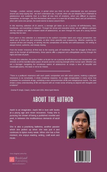 ""Teenage.....excited, worried, anxious. A period when you think no one understands you and everyone around you keep saying that - we don't understand you. A period, when you are stepping from childhood to adolescence and suddenly their is a flood of new kind of emotions, which are difficult to express. Sometimes, as teenager, one find themselves alone even in a room full of known faces and yet sometimes, when with some one person, the world seems to dance around them. In this stunning collection of 21 poems, a teenage girl takes us on a journey of self-discovery, love, heartbreak, and everything in between. Through her lyrical and evocative words, we are offered a glimpse into the complex and often turbulent world of adolescence, as seen through the eyes of a young woman coming into her own. Each poem in this collection is a testament to the author's incredible talent and unique perspective. Her words are at times raw and vulnerable, at other times powerful and empowering. Whether exploring the nuances of love and longing, or delving into the complexities of identity and self-expression, her writing is always honest, authentic, and deeply moving. From the tender innocence of first love to the searing pain of heartbreak, from the struggle to find one's voice to the triumph of self-discovery, these poems offer a poignant and unforgettable journey through the highs and lows of youth. Through this collection, the author invites us to join her on a journey of self-discovery and introspection, and reminds us of the transformative power of words and the enduring strength of the human spirit. Whether you are a teenager navigating the tumultuous waters of adolescence or simply a lover of beautiful and meaningful poetry, this book is not to be missed.""