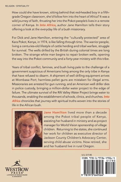 How could she have known, sitting behind that red-headed boy in a fifth-grade Oregon classroom, she'd follow him into the heart of Africa? It was a wild journey of faith, thrusting her into the Pokot people's lives in a remote corner of Kenya. In Into Africa, author Jane Hamilton tells their story offering a look at the everyday life of a bush missionary. For Dick and Jane Hamilton, entering the "culturally protected" area of Kara Pokot, Kenya, in 1974, is like falling through time. The warrior people, living a centuries-old lifestyle of cattle herding and tribal warfare, struggle for survival. The wells drilled by the British during colonial times are long broken. The strange white man begins to repair broken wells, opening the way into the Pokot community and a forty-year ministry with this tribe. Years of tribal conflict, famines, and bush living pale to the challenge of a government suspicious of Americans living among the only tribe in Kenya that have refused to disarm. A shipment of well drilling equipment arrives at Mombasa Port; harmless pellet guns are mistaken for illegal arms. Missionaries are arrested for gun running, and an American well driller dies in police custody, bringing a million-dollar water project to the edge of failure. The ultimate survival of the Rift Valley Water Project brings water to thousands, enabling the establishment of schools, clinics, and churches. Into Africa chronicles that journey with spiritual truths woven into the stories of life in the African bush.