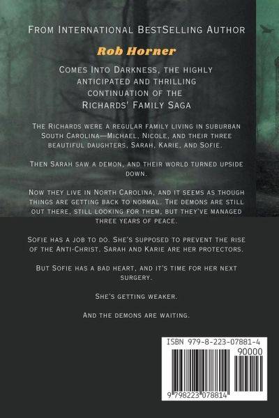 From International Best-Selling Author Rob Horner comes Into Darkness, the highly anticipated and thrilling continuation of the Richards' family saga. The Richards were a regular family living in suburban South Carolina--Michael, Nicole, and their three beautiful daughters: Sarah, Karie, and Sofie. Then Sarah saw a demon, and their world turned upside down. Now they live in North Carolina, and it seems as though things are getting back to normal. The demons are still out there, still looking for them, but they've managed three years of peace. Sofie has a job to do. She's supposed to prevent the ride of the Anti-Christ. Sarah and Karie are her protectors. But Sofie has a bad heart, and it's time for her next surgery. She's getting weaker. And the demons are waiting.