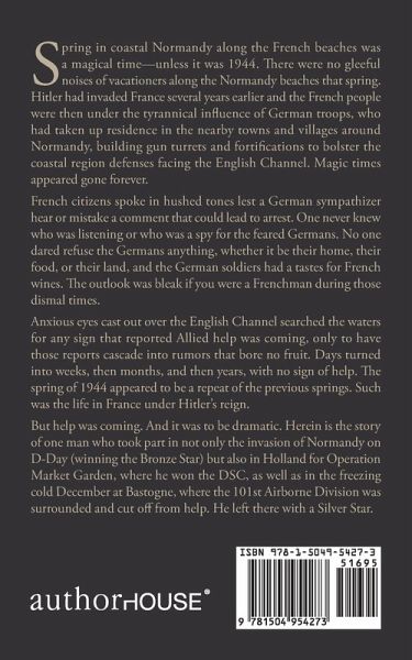 Spring in coastal Normandy along the French beaches was a magical time-unless it was 1944. There were no gleeful noises of vacationers along the Normandy beaches that spring. Hitler had invaded France several years earlier and the French people were then under the tyrannical influence of German troops, who had taken up residence in the nearby towns and villages around Normandy, building gun turrets and fortifications to bolster the coastal region defenses facing the English Channel. Magic times appeared gone forever. French citizens spoke in hushed tones lest a German sympathizer hear or mistake a comment that could lead to arrest. One never knew who was listening or who was a spy for the feared Germans. No one dared refuse the Germans anything, whether it be their home, their food, or their land, and the German soldiers had a tastes for French wines. The outlook was bleak if you were a Frenchman during those dismal times. Anxious eyes cast out over the English Channel searched the waters for any sign that reported Allied help was coming, only to have those reports cascade into rumors that bore no fruit. Days turned into weeks, then months, and then years, with no sign of help. The spring of 1944 appeared to be a repeat of the previous springs. Such was the life in France under Hitler's reign. But help was coming. And it was to be dramatic. Herein is the story of one man who took part in not only the invasion of Normandy on D-Day (winning the Bronze Star) but also in Holland for Operation Market Garden, where he won the DSC, as well as in the freezing cold December at Bastogne, where the 101st Airborne Division was surrounded and cut off from help. He left there with a Silver Star.
