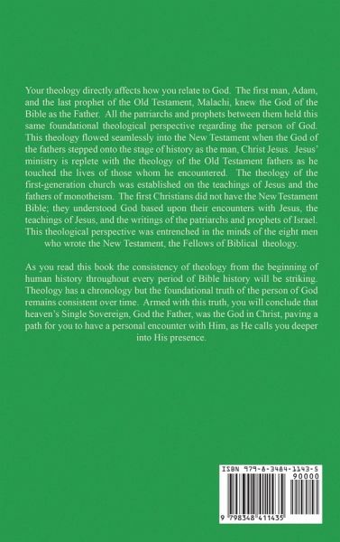 Your theology directly affects how you relate to God. The first man, Adam, and the last prophet of the Old Testament, Malachi, knew the God of the Bible as the Father. All the patriarchs and prophets between them held this same foundational theological perspective regarding the person of God. This theology flowed seamlessly into the New Testament when the God of the fathers stepped onto the stage of history as the man, Christ Jesus. Jesus' ministry is replete with the theology of the Old Testament fathers as he touched the lives of those whom he encountered. The theology of the first-generation church was established on the teachings of Jesus and the fathers of monotheism. The first Christians did not have the New Testament Bible; they understood God based upon their encounters with Jesus, the teachings of Jesus, and the writings of the patriarchs and prophets of Israel. This theological perspective was entrenched in the minds of the eight men who wrote the New Testament, the Fellows of Biblical theology. As you read this book the consistency of theology from the beginning of human history throughout every period of Bible history will be striking. Theology has a chronology but the foundational truth of the person of God remains consistent over time. Armed with this truth, you will conclude that heaven's Single Sovereign, God the Father, was the God in Christ, paving a path for you to have a personal encounter with Him, as He calls you deeper into His presence.
