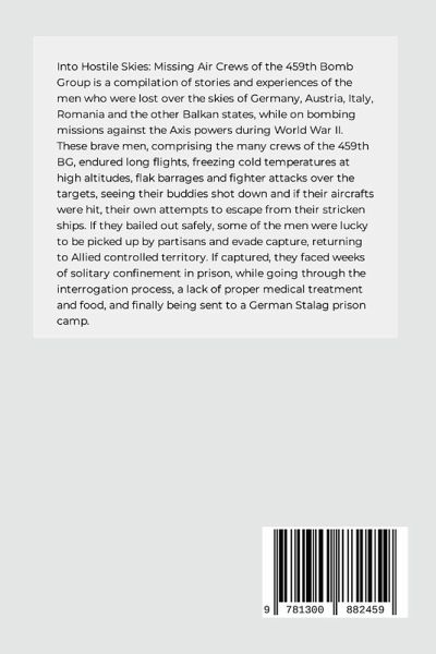 Into Hostile Skies: Missing Air Crews of the 459th Bomb Group is a compilation of stories and experiences of the men who were lost over the skies of Germany, Austria, Italy, Romania and the other Balkan states, while on bombing missions against the Axis powers during World War II. These brave men, comprising the many crews of the 459th BG, endured long flights, freezing cold temperatures at high altitudes, flak barrages and fighter attacks over the targets, seeing their buddies shot down and if their aircrafts were hit, their own attempts to escape from their stricken ships. If they bailed out safely, some of the men were lucky to be picked up by partisans and evade capture, returning to Allied controlled territory. But many faced the wrath of hostile civilians, who wanted to end their lives quickly. If captured, faced weeks of solitary confinement in prison, while going through the interrogation process, a lack of proper medical treatment and food, and finally being sent to a German Stalag prison camp.