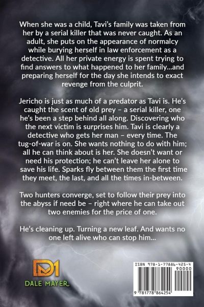 When she was a child, Tavi's family was taken from her by a serial killer that was never caught. As an adult, she puts on the appearance of normalcy while burying herself in law enforcement as a detective. All her private energy is spent trying to find answers to what happened to her family...and preparing herself for the day she intends to exact revenge from the culprit. Jericho is just as much of a predator as Tavi is. He's caught the scent of old prey - a serial killer, one he's been a step behind all along. Discovering who the next victim is surprises him. Tavi is clearly a detective who gets her man - every time. The tug-of-war is on. She wants nothing to do with him; all he can think about is her. She doesn't want or need his protection; he can't leave her alone to save his life. Sparks fly between them the first time they meet, the last, and all the times in-between. Two hunters converge, set to follow their prey into the abyss if need be - right where he can take out two enemies for the price of one. He's cleaning up. Turning a new leaf. And wants no one left alive who can stop him...