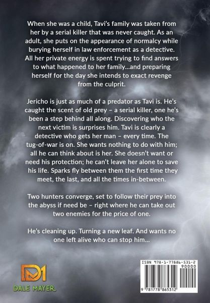 When she was a child, Tavi's family was taken from her by a serial killer that was never caught. As an adult, she puts on the appearance of normalcy while burying herself in law enforcement as a detective. All her private energy is spent trying to find answers to what happened to her family...and preparing herself for the day she intends to exact revenge from the culprit. Jericho is just as much of a predator as Tavi is. He's caught the scent of old prey - a serial killer, one he's been a step behind all along. Discovering who the next victim is surprises him. Tavi is clearly a detective who gets her man - every time. The tug-of-war is on. She wants nothing to do with him; all he can think about is her. She doesn't want or need his protection; he can't leave her alone to save his life. Sparks fly between them the first time they meet, the last, and all the times in-between. Two hunters converge, set to follow their prey into the abyss if need be - right where he can take out two enemies for the price of one. He's cleaning up. Turning a new leaf. And wants no one left alive who can stop him...