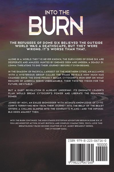 Desperate and shellshocked, the survivors of Dome Six face a foreign and terrifying threat: The outside world. To Owen and his fellow Domies, the forest west of the Willamette River might as well be an alien world. Every sight, smell, and sound is new. They should be grateful, but right now, they're just focused on getting through the next few hours alive. Every one of them is a ticking time bomb. Whispers of an underground militia lead them to Pacifica's doorstep. A motley group of survivors called the Phage are led by a charismatic Cytocorp defector who offers not only help, but a plan. All the Domies have to do is join their cause. A beautiful badass biomodder, exiled and left for dead by the Company, soon joins the fray, and the Phage's carefully laid plan is set into motion. Will the long game they've been playing finally pay off, or has Cytocorp's iron grip on humanity become unbreakable? Into the Burn continues the high-stakes dystopian adventure begun in Dome Six. If you like twisty,nonstop action, scary biotech, and complex characters, you'll love this breathlessly paced second chapter of C.P. James' breakout series, The Cytocorp Saga.