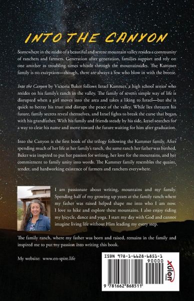 Somewhere in the midst of a beautiful and serene mountain valley resides a community of ranchers and farmers. Generation after generation, families support and rely on one another as troubling times whistle through the mountainsides. The Kammer family is no exception-though, there are always a few who blow in with the breeze. Into the Canyon by Victoria Baker follows Izrael Kammer, a high school senior who resides on his family's in the valley. The family of seven's simple way of life is disrupted when a girl moves into the area and takes a liking to Izrael-but she is quick to betray his trust and disrupt the peace of the valley. While lies threaten his future, family secrets reveal themselves, and Izrael fights to break the curse that began with his grandfather. With his family and friends steady by his side, Izrael searches for a way to clear his name and move toward the future waiting for him after graduation. Into the Canyon is the first book of the trilogy following the Kammer family. After spending much of her life at her family's ranch, the same ranch her father was birthed, Baker was inspired to put her passion for writing, her love for the mountains, and her commitment to family unity into words. The Kammer family resembles the quaint, tender, and hardworking existence of farmers and ranchers everywhere.