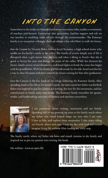 Somewhere in the midst of a beautiful and serene mountain valley resides a community of ranchers and farmers. Generation after generation, families support and rely on one another as troubling times whistle through the mountainsides. The Kammer family is no exception-though, there are always a few who blow in with the breeze. Into the Canyon by Victoria Baker follows Izrael Kammer, a high school senior who resides on his family's ranch in the valley. The family of seven's simple way of life is disrupted when a girl moves into the area and takes a liking to Izrael-but she is quick to betray his trust and disrupt the peace of the valley. While lies threaten his future, family secrets reveal themselves, and Izrael fights to break the curse that began with his grandfather. With his family and friends steady by his side, Izrael searches for a way to clear his name and move toward the future waiting for him after graduation. Into the Canyon is the first book of the trilogy following the Kammer family. After spending much of her life at her family's ranch, the same ranch her father was birthed. Baker was inspired to put her passion for writing, her love for the mountains, and her commitment to family unity into words. The Kammer family resembles the quaint, tender, and hardworking existence of farmers and ranchers everywhere. I am passionate about writing, mountains and my family. Spending half of my growing up years at the family ranch where my father was raised helped shape me into who I am now. I love to hike and explore these mountains. I also enjoy riding my bicycle, dance and yoga. I start my day with God and cannot imagine living life without Him leading my every step. The family ranch, where my father was born and raised, remains in the family and inspired me to put my passion into writing this book. My website: www.en-spire.life