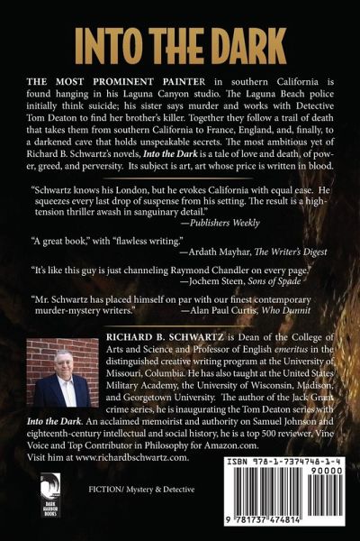 An engaging, hard-boiled mystery. The most prominent painter in southern California is found hanging in his Laguna Canyon studio. The Laguna Beach police initially think suicide; his sister says murder and works with Detective Tom Deaton to find her brother's killer. Together they follow a trail of death that takes them from southern California to France, England, and, finally, to a darkened cave that holds unspeakable secrets. The most ambitious yet of Richard B. Schwartz's novels, Into the Dark is a tale of love and death, of power, greed, and perversity. Its subject is art, art whose price is written in blood.