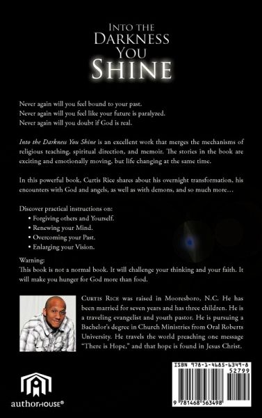Never again will you feel bound to your past. Never again will you feel like your future is paralyzed. Never again will you doubt if God is real. Into the Darkness You Shine is an excellent work that mergers the mechanisms of religious teaching, spiritual direction, and memoir. The stories in the book are exciting and emotionally moving, but life changing at the same time. In this powerful book, Curtis Rice shares about his overnight transformation, his encounters with God and angels, as well with demons, and much more... Discover practical instructions on: ¿ Forgiving others and Yourself. ¿ Renewing your Mind. ¿ Overcoming your Past. ¿ Enlarging your Vision. Warning: This book is not a normal book. It will challenge your thinking and your faith. It will make you hunger for God more than food.