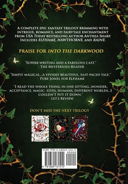 Prophecy demands she marry a Dark Elf prince, but Mara Geary refuses to meekly accept her fate. Danger, adventure, and romance await in the magical forest of the Darkwood, where an intrepid heroine and a warrior prince must learn to trust one another before their kingdom is devoured by an ancient enemy... A complete epic fantasy trilogy brimming with intrigue, royalty, and fairytale enchantment from USA Today bestselling author Anthea Sharp. Includes: ELFHAME, HAWTHORNE, and RAINE Mara Geary faces a bleak future in the village of Little Hazel until, on the eve of her seventeenth birthday, strange glowing lights beckon her into the mysterious shadows of the Darkwood. She follows, seeking adventure. What she finds is her destiny... Prince of the Hawthorne Court, Brannon Luthinor has spent his life becoming a powerful warrior-mage in order to save his people. Now, on the eve of war, his fate is rapidly approaching. Brought together by fate, Bran and Mara forge an uneasy alliance. But in the face of evil, they must find a way to trust their lives - and their hearts - to one another.