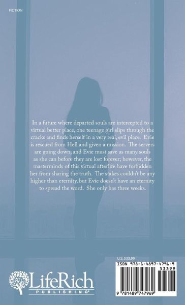 In a future where departed souls are intercepted to a virtual better place, one teenage girl slips through the cracks and finds herself in a very real, evil place. Evie is rescued from Hell and given a mission. The servers are going down, and Evie must save as many souls as she can before they are lost forever; however, the masterminds of this virtual afterlife have forbidden her from sharing the truth. The stakes couldn't be any higher than eternity, but Evie doesn't have an eternity to spread the word. She only has three weeks.