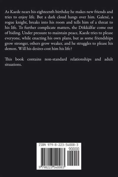 As Kaede nears his eighteenth birthday he makes new friends and tries to enjoy life. But a dark cloud hangs over him. Galené, a rogue knight, breaks into his room and tells him of a threat to his life. To further complicate matters, the Dökkálfar come out of hiding. Under pressure to maintain peace, Kaede tries to please everyone, while enacting his own plans, but as some friendships grow stronger, others grow weaker, and he struggles to please his demon. Will his desires cost him his life? This book contains non-standard relationships and adult situations.