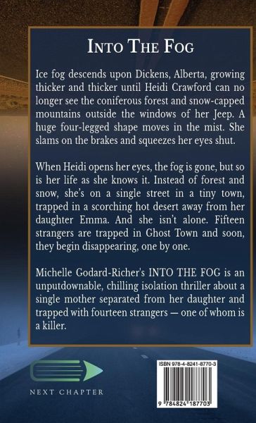 Ice fog descends upon Dickens, Alberta, growing thicker and thicker until Heidi Crawford can no longer see the coniferous forest and snow-capped mountains outside the windows of her Jeep. A huge four-legged shape moves in the mist. She slams on the brakes and squeezes her eyes shut. When Heidi opens her eyes, the fog is gone, but so is her life as she knows it. Instead of forest and snow, she's on a single street in a tiny town, trapped in a scorching hot desert away from her daughter Emma. And she isn't alone. Fifteen strangers are trapped in Ghost Town and soon, they begin disappearing, one by one. Michelle Godard-Richer's INTO THE FOG is an unputdownable, chilling isolation thriller about a single mother separated from her daughter and trapped with fourteen strangers - one of whom is a killer.