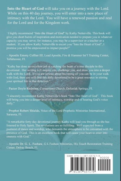 Into the Heart of God will take you on a journey with the Lord. While on this 40 day journey, you will enter into a new place of intimacy with the Lord. You will have a renewed passion and zeal for the Lord and for the Kingdom work. Kathy Netterville is the founder and visionary for Joy of Faith Prayer, a prophetic, evangelistic prayer ministry. She is also a minister of the arts, utilizing flags, billows and worship cloths. She has a passion to see the lost come to Christ and to see the body of Christ empowered to do the work of the kingdom.