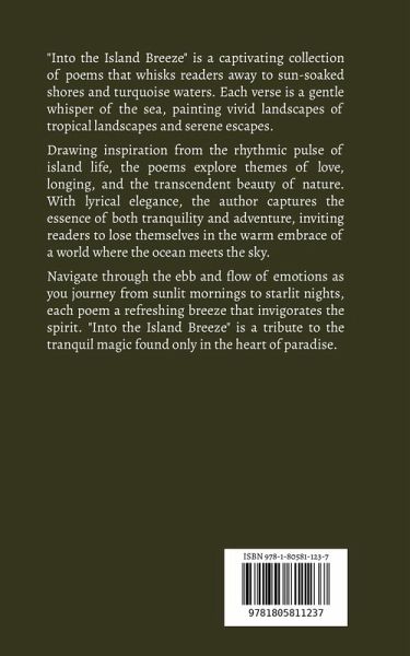"Into the Island Breeze" is a captivating collection of poems that whisks readers away to sun-soaked shores and turquoise waters. Each verse is a gentle whisper of the sea, painting vivid landscapes of tropical landscapes and serene escapes. Drawing inspiration from the rhythmic pulse of island life, the poems explore themes of love, longing, and the transcendent beauty of nature. With lyrical elegance, the author captures the essence of both tranquility and adventure, inviting readers to lose themselves in the warm embrace of a world where the ocean meets the sky. Navigate through the ebb and flow of emotions as you journey from sunlit mornings to starlit nights, each poem a refreshing breeze that invigorates the spirit. "Into the Island Breeze" is a tribute to the tranquil magic found only in the heart of paradise.