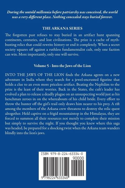 During the untold millennia before patriarchy was conceived, the world was a very different place. Nothing concealed stays buried forever. THE ARKANA SERIES The forgotten past refuses to stay buried in an artifact hunt spanning continents, centuries, and lost civilizations. The prize is a cache of myth-busting relics that could rewrite history or end it completely. When a secret society squares off against a ruthless fundamentalist cult, only one faction can win. More importantly, only one will survive. Volume 5 - Into the Jaws of the Lion INTO THE JAWS OF THE LION finds the Arkana agents on a new adventure in India where they search for a jewel-encrusted figurine that holds a clue to an even more priceless artifact. Beating the Nephilim to the prize is the least of their worries. Back in the States, the cult's leader has evolved a plan to release a deadly plague on an unsuspecting world just as his henchman zeroes in on the whereabouts of his child bride. Every effort to throw the hunter off the girl's trail only draws him nearer to his prey. A rift among the members of the Arkana crew threatens to destroy the relic quest altogether. Held captive on a frigid mountaintop in the Himalayas, they are forced to summon all their resources not merely to complete their mission but simply to survive the night. If you thought you knew where this saga was headed, be prepared for a shocking twist when the Arkana team wanders blindly into the lion's jaws.