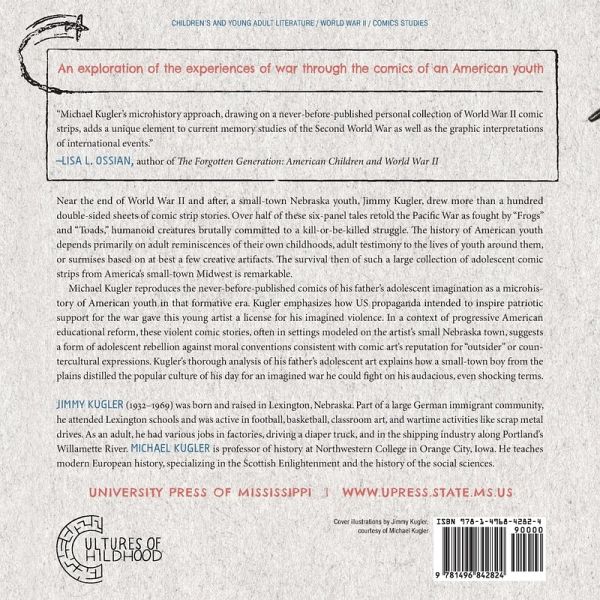 Near the end of World War II and after, a small-town Nebraska youth, Jimmy Kugler, drew more than a hundred double-sided sheets of comic strip stories. Over half of these six-panel tales retold the Pacific War as fought by "Frogs" and "Toads," humanoid creatures brutally committed to a kill-or-be-killed struggle. The history of American youth depends primarily on adult reminiscences of their own childhoods, adult testimony to the lives of youth around them, or surmises based on at best a few creative artifacts. The survival then of such a large collection of adolescent comic strips from America's small-town Midwest is remarkable. Michael Kugler reproduces the never-before-published comics of his father's adolescent imagination as a microhistory of American youth in that formative era. Also included in Into the Jungle! A Boy's Comic Strip History of World War II are the likely comic book models for these stories and inspiration from news coverage in newspapers, radio, movies, and newsreels. Kugler emphasizes how US propaganda intended to inspire patriotic support for the war gave this young artist a license for his imagined violence. In a context of progressive American educational reform, these violent comic stories, often in settings modeled on the artist's small Nebraska town, suggests a form of adolescent rebellion against moral conventions consistent with comic art's reputation for "outsider" or countercultural expressions. Kugler also argues that these comics provide evidence for the transition in American taste from war stories to the horror comics of the late 1940s and early 1950s. Kugler's thorough analysis of his father's adolescent art explains how a small-town boy from the plains distilled the popular culture of his day for an imagined war he could fight on his audacious, even shocking terms.