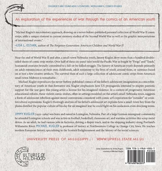 Near the end of World War II and after, a small-town Nebraska youth, Jimmy Kugler, drew more than a hundred double-sided sheets of comic strip stories. Over half of these six-panel tales retold the Pacific War as fought by "Frogs" and "Toads," humanoid creatures brutally committed to a kill-or-be-killed struggle. The history of American youth depends primarily on adult reminiscences of their own childhoods, adult testimony to the lives of youth around them, or surmises based on at best a few creative artifacts. The survival then of such a large collection of adolescent comic strips from America's small-town Midwest is remarkable. Michael Kugler reproduces the never-before-published comics of his father's adolescent imagination as a microhistory of American youth in that formative era. Also included in Into the Jungle! A Boy's Comic Strip History of World War II are the likely comic book models for these stories and inspiration from news coverage in newspapers, radio, movies, and newsreels. Kugler emphasizes how US propaganda intended to inspire patriotic support for the war gave this young artist a license for his imagined violence. In a context of progressive American educational reform, these violent comic stories, often in settings modeled on the artist's small Nebraska town, suggests a form of adolescent rebellion against moral conventions consistent with comic art's reputation for "outsider" or countercultural expressions. Kugler also argues that these comics provide evidence for the transition in American taste from war stories to the horror comics of the late 1940s and early 1950s. Kugler's thorough analysis of his father's adolescent art explains how a small-town boy from the plains distilled the popular culture of his day for an imagined war he could fight on his audacious, even shocking terms.