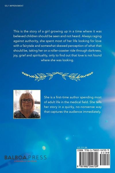 This is the story of a girl growing up in a time where it was believed children should be seen and not heard. Always raging against authority, she spent most of her life looking for love with a fairytale and somewhat skewed perception of what that should be, taking her on a roller-coaster ride through darkness, joy, grief and spirituality, only to find out that love is not found where she was looking.