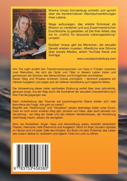 Into The Light erzählt den Transformationsprozess von Hass in Frieden zwischen zwei Menschen, die sich als Opfer und Täter in diesem Leben trafen und gemeinsam die Grenzen des Menschlichen und Erträglichen erlebten. Dieser Weg und Prozess schienen Ursula unmöglich - dennoch passierte ein höherer Ausgleich und zeigte sich ein tieferes Verständnis auf unerwartete und magische Weise. Die Vorbereitung dieser tiefen spirituellen Erfahrung verlief über zwei Jahrzehnte, genauso lange, wie der Weg durch die Dunkelheit der sexuellen Gewalterfahrung in ihrer Familie gegangen war. Nach Aufarbeitung des Traumas auf psychologischer Ebene stellen sich viele Betroffene die Frage: Wie geht es weiter? Begriffe wie "Vergebung" und "Verzeihen" setzen ehemalige Opfer oft unter Druck. Dass es noch einen anderen Weg gibt, jenseits von Hass, aber auch weitergehend als Vergebung - der Weg der Seele, des tiefsten Verständnisses und der höchsten Erkenntnis, wissen die wenigsten. Dort, wo Dunkelheit, Angst, Hass und Verzweiflung waren, entsteht tatsächlich Frieden, Harmonie, tiefe Erkenntnis und Ausgleich. Nicht im Kopf, sondern spürbar im Herzen und mit jeder Zelle des Körpers. Ein Buch mit dem Potential, das Leben des Lesers radikal zu verändern und eigene Türen ins Licht zu öffnen.