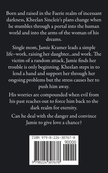 Born and raised in the Faerie realm of incessant darkness, Kheelan Sincleir's present and future changes when he stumbles through a portal into the human world filled with light and into the arms of the woman of his dreams. Single mom, Jamie Kramer leads a simple life . . . work, raising her daughter, and work. The victim of a seemingly random late-night attack, Jamie finds her trouble is only beginning. Kheelan steps in to lend a hand and support her through her ongoing problems but the stress causes her to push away from him and rethink the relationship. Kheelan's worries are compounded when evil from his past reaches out to capture and force him back to the dark realm for eternity. He must take steps to eliminate the danger to both his worlds. Can he deal with the threat on his life and convince Jamie to give love a chance?