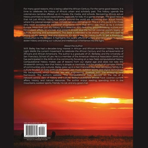 For many good reasons, this is being called the African Century. For the same good reasons, it is time to celebrate the history of Africa's urban and scholarly past. This history upends the colonial-era narrative offered up in movies, the media, and schools. Recovering Africa's actual history promises to boost expectations, especially for kids. It's a game changer. The good news is that not just Africa's history, but people around the world are recovering their actual history, where the colonial savage-versus-civilized narrative still hangs on. This is a who-done-it for those who never accepted the traditional progressive claim that Africa was lifted up by a civilized Europe. More than just dry history, it's a detective story featuring groundbreaking authors and filmmakers' efforts to uncover and present Africa's and the former colonial world's legacy of culture, learning, and achievement. This book is intended to be shared with kids and read by young adults, parents, and grandparents. It's also a way for history buffs to get a thumbnail introduction to the subject. It highlights the recent efforts of writers and filmmakers to restore stolen history and bring our cultural and intellectual inheritance into the light. About the Author W.R. Bailey has had a decades-long interest in African and African-American history. Into the Light distills the current movement to celebrate the African Century and the achievements of Africans and African-Americans. The author is a graduate of UC Berkeley and the University of San Francisco, School of Law. He is a member of the American Historical Association (AHA) and has participated in the AHA on-line community focusing on a new field, computational history. Computational history makes use of lessons from our digital age and does not take the nineteenth century view that history is simple or inevitable, but the product of complex mixing of communities and cultures. Bailey grew up in a San Francisco Bay Area aerospace family in a culture focused on lively political discussion, jazz music, outdoor sports, and digital technology. His background, which includes law and engineering, dovetails with this emerging new framework. The author's website, "The Computational Age," focuses on the rise of a network-centric view of history and culture. Bailey's published articles have covered current affairs, history, and natural resources. The author enjoys reading, spending time in the mountains, outdoor sports, friends, his cat, and any good chat.