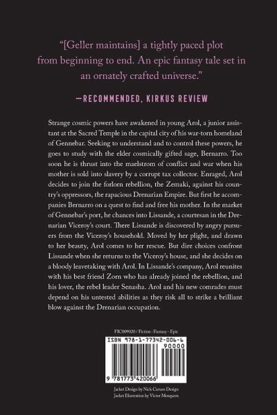 Strange cosmic powers have awakened in young Arol, a junior assistant at the Sacred Temple in the capital city of his war-torn homeland of Gennebar. Seeking to understand and to control these powers, he goes to study with the elder cosmically gifted sage, Bernarro. Too soon he is thrust into the maelstrom of conflict and war when his mother is sold into slavery by a corrupt tax collector. Enraged, Arol decides to join the forlorn rebellion, the Zemaki, against his country's oppressors, the rapacious Drenarian Empire. But first he accompanies Bernarro on a quest to find and free his mother. In the market of Gennebar's port, he chances into Lissande, a courtesan in the Drenarian Viceroy's court. There Lissande is discovered by angry pursuers from the Viceroy's household. Moved by her plight, and drawn to her beauty, Arol comes to her rescue. But dire choices confront Lissande when she returns to the Viceroy's house, and she decides on a bloody leavetaking with Arol. In Lissande's company, Arol reunites with his best friend Zorn who has already joined the rebellion, and his lover, the rebel leader Senasha. Arol and his new comrades must depend on his untested abilities as they risk all to strike a brilliant blow against the Drenarian occupation.