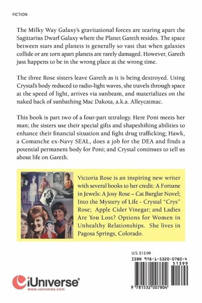The Milky Way Galaxy's gravitational forces are tearing apart the Sagittarius Dwarf Galaxy where the Planet Gareth resides. The space between stars and planets is generally so vast that when galaxies collide or are torn apart planets are rarely damaged. However, Gareth just happens to be in the wrong place at the wrong time. The three Rose sisters leave Gareth as it is being destroyed. Using Crystal's body reduced to radio-light waves, she travels through space at the speed of light, arrives via sunbeam, and materializes on the naked back of sunbathing Mac Dakota, a.k.a. Alleycatmac. This book is part two of a four-part tetralogy. Here Poni meets her man; the sisters use their special gifts and shapeshifting abilities to enhance their financial situation and fight drug trafficking; Hawk, a Comanche ex-Navy SEAL, does a job for the DEA and finds a potential permanent body for Poni; and Crystal continues to tell us about life on Gareth.