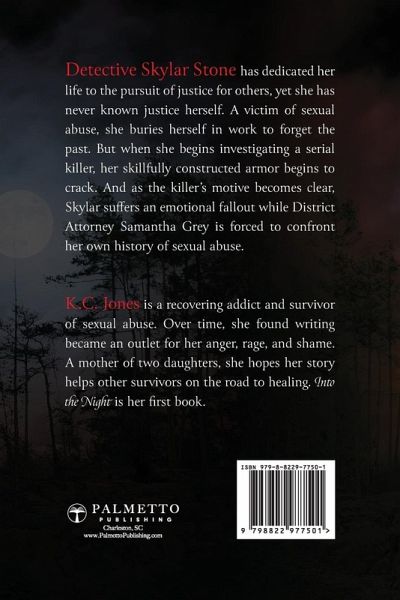United by their shared belief in justice, a serial killer, a detective, and a prosecutor must face the shadows of their respective pasts to find peace. In Into the Night, three parallel stories of sexual abuse converge as vengeance and justice are pursued. A dedicated detective Skylar Stone never hesitates when it comes to abiding by the law, but when she begins investigating a serial killer, her commitment to justice is muddied by her own history of sexual abuse. And as Skylar grapples with the emotional strain, District Attorney Samantha Grey must confront her own sexual abuse. Having found creative, and not so innocent, ways to avoid her trauma, Samatha now realizes she can no longer outrun her past or shame. And as the serial killer selects his next prey, it becomes apparent that he, too, is a victim of sexual abuse. While all three believe in justice, only two are sworn to uphold the law no matter what. But this is no ordinary case. Exposing the scars of sexual abuse, K.C. Jones's debut novel raises awareness while encouraging real-life victims to seek the help they need to heal.