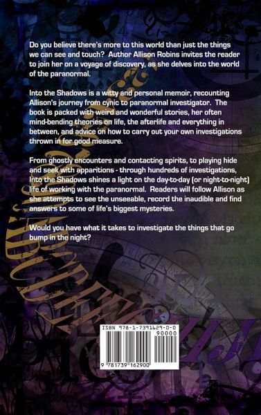 Do you believe there's more to this world than just the things we can see and touch? Author Allison Robins invites the reader to join her on a voyage of discovery, as she delves into the world of the paranormal. Into the Shadows is a witty and personal memoir, recounting Allison's journey from cynic to paranormal investigator. The book is packed with weird and wonderful stories, her mind-bending theories on life, the afterlife and everything in between, with advice on how to carry out your own investigations thrown in for good measure. From ghostly encounters and contacting spirits, to playing hide and seek with apparitions - through hundreds of investigations, Into the Shadows shines a light on the day-to-day (or night-to-night) life of working with the paranormal. Readers will follow Allison as she attempts to see the unseeable, record the inaudible and find answers to some of life's biggest mysteries. Would you have what it takes to investigate the things that go bump in the night?