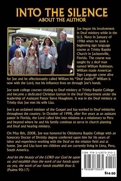 Into the Silence was written with the intent to motivate, challenge and educate God's servants regarding the needs and uniqueness of ministering among the Deaf. It is also intended to serve as an informative introductory text for Deaf ministry and missions for pastors and Christian servants alike. There are many books on deafness, deaf education, sign language and Deaf culture. However, there are not many that deal with the subject of Deaf missions and the great need for missionaries and ministries for the Deaf worldwide. This book is an effort to help fill that need and to provide motivation and vision to those who would give their lives to the Lord in the service of the Deaf.Statistics presented have been researched but have not been scientifically verified. They were gleaned and developed from various sources with the intent of adding context to the need for ministry among the Deaf. When referring to the use of the word deaf in this book, "deaf" is used in reference to the medical/audiological/pathological loss of hearing and "Deaf" is used as it relates to Deaf community and Deaf culture. This book is primarily based on my personal experience, observation and opinion. It is not intended to contradict, criticize or stand above another's opinions or methods of ministry. I pray you will find this book helpful and insightful; especially to those whom God has called to work with the Deaf or those who are considering a Deaf ministry in their church as part of their global missionary effort. Time is short. We must be busy about the Master's business in reaching this greatly under-reached people group.