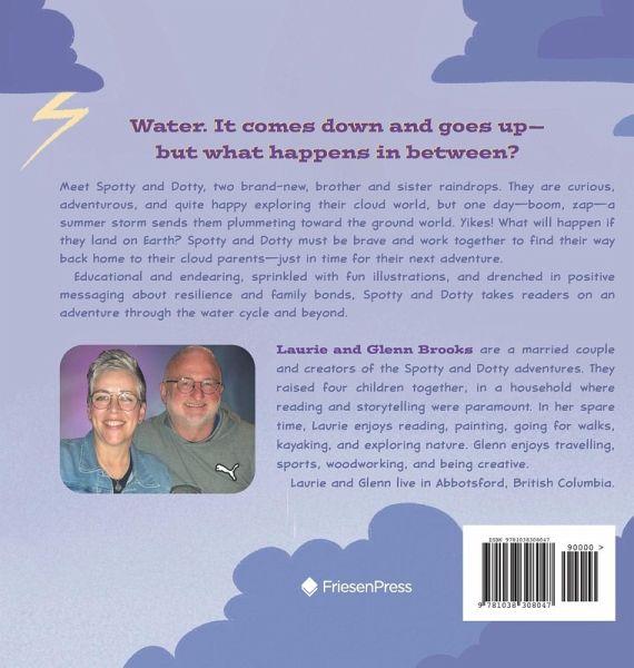 Water. It comes down and goes up-but what happens in between? Meet Spotty and Dotty, two brand-new, brother and sister raindrops. They are curious, adventurous, and quite happy exploring their cloud world, but one day-boom, zap-a summer storm sends them plummeting toward the ground world. Yikes! What will happen if they land on Earth? Spotty and Dotty must be brave and work together to find their way back home to their cloud parents-just in time for their next adventure. Educational and endearing, sprinkled with fun illustrations, and drenched in positive messaging about resilience and family bonds, Spotty and Dotty takes readers on an adventure through the water cycle and beyond.