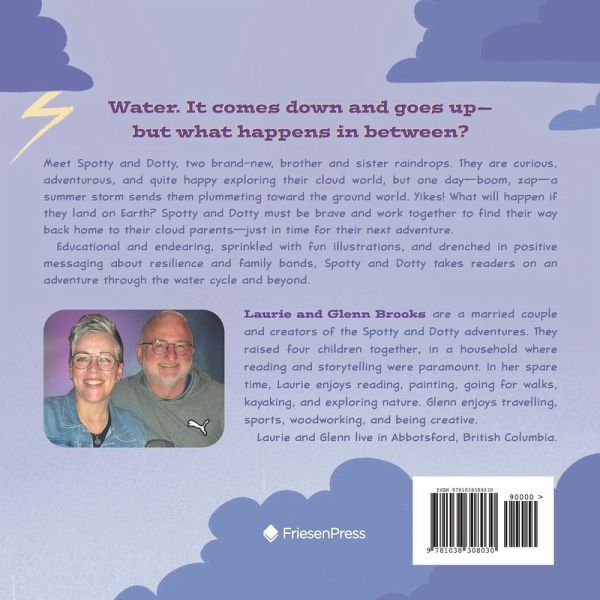Water. It comes down and goes up-but what happens in between? Meet Spotty and Dotty, two brand-new, brother and sister raindrops. They are curious, adventurous, and quite happy exploring their cloud world, but one day-boom, zap-a summer storm sends them plummeting toward the ground world. Yikes! What will happen if they land on Earth? Spotty and Dotty must be brave and work together to find their way back home to their cloud parents-just in time for their next adventure. Educational and endearing, sprinkled with fun illustrations, and drenched in positive messaging about resilience and family bonds, Spotty and Dotty takes readers on an adventure through the water cycle and beyond.