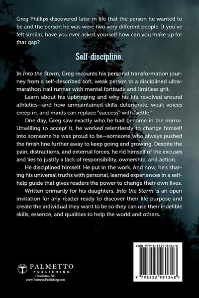 For the first time, experience the thrilling, mind-altering personal transformation journey of ultra-endurance athlete Greg Phillips, where he discovered his purpose and changed his life. Written and dedicated to his daughters, Into the Storm is half-memoir, half-self-help and combines universal truths with personal, learned experiences for a uniquely helpful book. Author Greg Phillips begins, as his races do, at the starting line. Learn about his upbringing and how his life revolved around athletics-and how unmaintained skills deteriorate, weak voices creep in, and his mind replaced "success" with "settle" before he even noticed. It's hard to look at yourself honestly, but one day, Greg saw exactly who he had become in the mirror. Then, he worked relentlessly to change imself into someone he was proud to be-someone who always pushed the finish line further away to keep going and growing. What follows is an incredibly insightful guide to building mental toughness, making the right (but hard) decisions for yourself and your future. Greg uses this analogy to hammer his point home. If you lie to yourself and downplay the severity of where you currently are, you are starting from the wrong spot and will never reach your goals. It's like building a house with a poor foundation. You might build an incredible-looking home with amazing features, landscaping, and beautiful interior decorating, but if the foundation is warped and cracked, your house is going to fall apart the first time a storm rolls in. So, are you ready to build a foundation you (and those in your life) can count on? If so, pick up a copy of Into the Storm today!