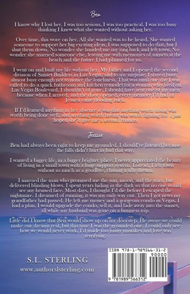 Ben I know why I lost her. I was too serious, I was too practical. I was too busy thinking I knew what she wanted without asking her. Over time, this wore on her. All she wanted was to be heard. She wanted someone to support her big exciting ideas, I was supposed to do that, but I shut them down. No wonder she handed me my ring back and left town. No wonder she married someone else, leaving me with memories of sunsets at the beach and the future I had planned for us. I went on and built my life without her. My father and I opened the second division of Sunset Builders in Las Vegas, and to my surprise, I stayed busy, almost busy enough not to notice the loneliness. That was until one day I was called to do a quick bathroom and kitchen remodel for a woman who lived on Las Vegas Boulevard. I shouldn't of gone, I should have sent one of my men because when I arrived, and the door opened, every memory I'd had of Jessica came flooding back. If I'd learned anything in her absence it was that anything worth doing was worth being done well, and anything worth having was worth fighting for. I just hoped she'd give me a second chance. Jessica Ben had always been right to keep me grounded. I should've listened because the falls didn't hurt as bad that way. I wanted a bigger life, in a bigger brighter place. I never appreciated the beauty of living in a small town with a huge support system. Instead, I left town without so much as a goodbye, chasing a silly dream. I married the man who promised me the sun, moon, and the stars, but delivered blinding blows. I spent years hiding in the dark so that no one would see my bruised face. Most days, I thought I'd die before I escaped the nightmare. I dreamed of running, it was my only way out. Then I got news my grandfather had passed. He left me money and a gorgeous condo in Vegas. I had a plan. I would upgrade the condo, sell it, and fade away into the sunset, all while my husband was gone on a business trip. Little did I know that Ben would show up on my doorstep. He swore we could make our dreams real, but this time I was the grounded one. I could only see how we would never work. I'd made too many mistakes and love was terrifying.