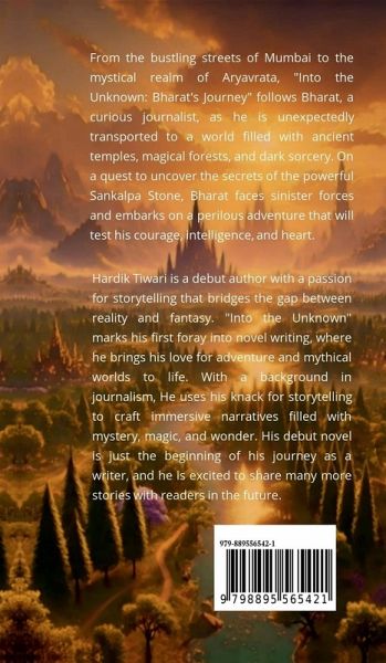 In "Into the Unknown: Bharat's Journey," Bharat, a determined journalist from Mumbai, is thrust into an extraordinary adventure when he's mysteriously transported to the magical realm of Aryavrata. Far from the familiar chaos of the city, he finds himself in a land filled with enchanted forests, towering ancient temples, and mystical forces that challenge everything he thought he knew. As Bharat explores Aryavrata, he uncovers the legend of the Sankalpa Stone, a powerful artifact with the potential to shape the fate of the realm. But he's not the only one searching for it. Raktashak, a dark sorcerer driven by chaos, seeks to harness the stone's immense power. With the looming threat of destruction, Bharat must form unlikely alliances and uncover Aryavrata's ancient secrets to protect both this realm and his own from eternal darkness. As Bharat delves deeper into Aryavrata's mysteries, he confronts his own fears and doubts, questioning whether he's capable of fulfilling a destiny he never asked for. The line between myth and reality fades as ancient prophecies come to life, testing his courage and resolve. Into the Unknown: Bharat's Journey is a gripping tale of adventure, magic, and self-discovery. With the stakes higher than ever, Bharat's quest will leave readers eagerly turning the pages, following him into the heart of the unknown. Will he unlock Aryavrata's secrets in time to stop Raktashak, or will darkness prevail? The answers await in this epic journey.