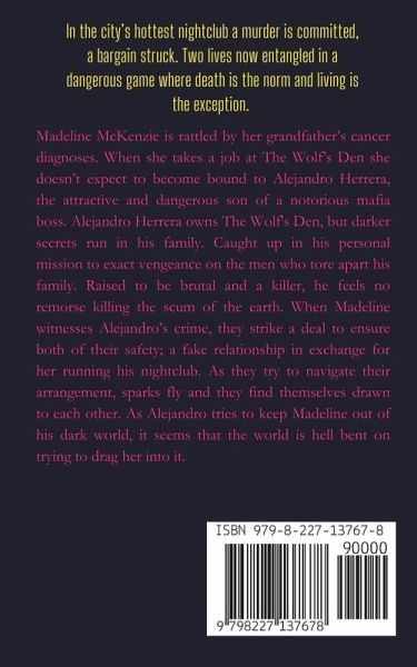 In the city's hottest nightclub a murder is committed, a bargain struck. Two lives now entangled in a dangerous game where death is the norm and living is the exception. Madeline McKenzie is rattled by her grandfather's cancer diagnoses. When she takes a job at The Wolf's Den she doesn't expect to become bound to Alejandro Herrera, the attractive and dangerous son of a notorious mafia boss. Alejandro Herrera owns The Wolf's Den, but darker secrets run in his family. Caught up in his personal mission to exact vengeance on the men who tore apart his family. Raised to be brutal and a killer, he feels no remorse killing the scum of the earth. When Madeline witnesses Alejandro's crime, they strike a deal to ensure both of their safety; a fake relationship in exchange for her running his nightclub. As they try to navigate their arrangement, sparks fly and they find themselves drawn to each other. As Alejandro tries to keep Madeline out of his dark world, it seems that the world is hell bent on trying to drag her into it.