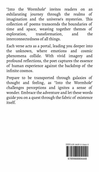 "Into the Wormhole" invites readers on an exhilarating journey through the realms of imagination and the universe's mysteries. This collection of poems transcends the boundaries of time and space, weaving together themes of exploration, transformation, and the interconnectedness of all things. Each verse acts as a portal, leading you deeper into the unknown, where emotions and cosmic phenomena collide. With vivid imagery and profound reflections, the poet captures the essence of human experience against the backdrop of the infinite cosmos. Prepare to be transported through galaxies of thought and feeling, as "Into the Wormhole" challenges perceptions and ignites a sense of wonder. Embrace the adventure and let these words guide you on a quest through the fabric of existence itself.