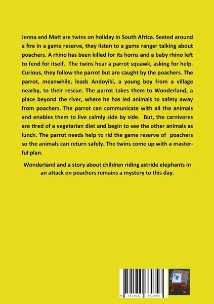 Jenna and Matt are twins on holiday in South Africa. Seated around a fire in a game reserve, they listen to a game ranger talking about poachers. A rhino has been killed for its horns and a baby rhino left to fend for itself. The twins hear a parrot squawk, asking for help. Curious they follow the parrot but are caught by the poachers. The parrot meanwhile leads Andoyiki, a young boy from a village nearby to their rescue. The parrot takes them to Wonderland, a place beyond the river, where he has led animals to safety away from poachers. The parrot can communicate with all the animals and enables them to live calmly side by side. But, the carnivores are tired of a vegetarian diet and begin to see the other animals as lunch. The parrot needs help to rid the game reserve of poachers so the animals can return safely. The twins come up with a masterful plan. Wonderland and a story about children riding astride elephants in an attack on poachers remains a mystery to this day.