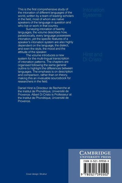 Preface Alan Cruttenden; 1. A survey of intonation systems Daniel Hirst and Albert Di Cristo; 2. Intonation in American English Dwight Bolinger; 3. Intonation in British English Daniel Hirst; 4. Intonation in German Dafydd Gibbon; 5. Intonation in Dutch Johan 't Hart; 6. Intonation in Swedish Eva Gårding; 7. Intonation in Danish Nina Grønnum; 8. Intonation in Spanish Santiago Alcoba and Julio Murillo; 9. Intonation in European Portuguese Madalena Cruz-Ferreira; 10. Intonation in Brazilian Portuguese João Antônio de Moraes; 11. Intonation in French Albert Di Cristo; 12. Intonation in Italian Mario Rossi; 13. Intonation in Romanian Laurentia Dascalu-Jinga; 14. Intonation in Russian Natalia Svetozarova; 15. Intonation in Bulgarian Anastasia Misheva and Michel Nikov; 16. Intonation in Greek Antonis Botinis; 17. Intonation in Finnish Annti Iivonen; 18. Intonation in Hungarian Ivan Fónagy; 19. Intonation in Moroccan Arabic Thami Benkirane; 20. Intonation in Japanese Isamu Abe; 21. Intonation in Thai Sudaporn Luksaneeyanawin; 22. Intonation in Vietnamese Dõ The Dung, Tran Thien Huong and Georges Boulakia; 23. Intonation in Beijing Chinese Paul Kratochvil; References; Indexes.