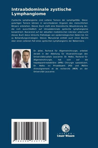 Zystische Lymphangiome sind seltene Tumore der Lymphgefäße. Diese gutartigen Tumore können in verschiedenen Organen des menschlichen Körpers entstehen. Dieses Buch stellt eine theoretische Aktualisierung dar, die sich ausschließlich auf intraabdominale zystische Lymphangiome konzentriert. Basierend auf der aktuellen medizinischen Literatur untersucht dieses Buch diese klinische Pathologie von epidemiologischen Daten bis hin zu Behandlungsstrategien. Dieses Manuskript enthält auch einen Bericht über einen seltenen Fall eines zystischen Lymphangioms der Nebenniere.