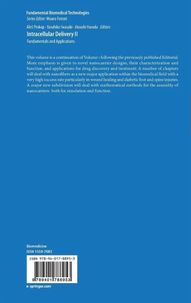 Editorial and Introduction to Volume 2.- Part I Novel nanocarrier design and processing.- Proprietary nanofiber technologies and scale-up.- Magnetically responsive (nano)biocomposites.-Zwitterionic nanocarriers for gene delivery.- Stimuli-responsive polymeric nanocarriers as promising drug and gene delivery systems.- Photo-responsive polymeric nanocarriers for on-demand drug delivery.- Part II Nanocarrier characterization and function.- Considerations on uptake and intracellular trafficking of nanocarriers.- Mucus as physiological barrier to intracellular delivery.- Investigation of nanoparticles in biological objects by electron microscopy techniques.- Gold nanoparticles for high resolution imaging in modern immunocytochemistry.- Design of functional polymers for intracellular drug nucleic acids delivery.- Membrane-domain-selective drug targeting based on lipid modification.- Multifuntional protein-based nanoparticles for theragnosis.- Cytocompatible phospholipid polymer for noninvasive nanodevice.- Intracellular protein delivery using self-assembled amphiphilic polysaccharide nanogels.- Part III Simulation for delivery and function.- Molecular dynamics simulations of polyplexes and lipoplexes.- Computational studies of highly pegylated sterically stabilized micelles self-assembly and drug solubilization.- Toward intracellular delivery and drug discovery,Stochastic logic networks as efficient computational models for gene regulatory networks.- Part IV Nanocarriers for drug discovery and treatment.- Nanodiamonds as intracellular probes for imaging in biology and medicine.- Intracellular delivery of RNA using RNA-binding proteins or peptides.- Hyaluronic acid based nanofibers for wound dressing and drug delivery carriers.- Potential of siRNA therapy in chronic myeloid leukemia.