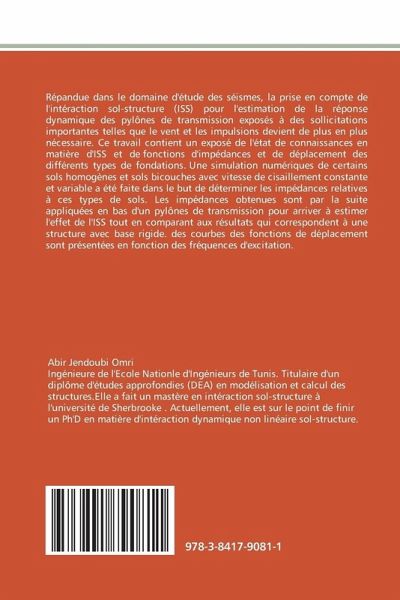 Répandue dans le domaine d'étude des séismes, la prise en compte de l'intéraction sol-structure (ISS) pour l'estimation de la réponse dynamique des pylônes de transmission exposés à des sollicitations importantes telles que le vent et les impulsions devient de plus en plus nécessaire. Ce travail contient un exposé de l'état de connaissances en matière d'ISS et de fonctions d'impédances et de déplacement des différents types de fondations. Une simulation numériques de certains sols homogènes et sols bicouches avec vitesse de cisaillement constante et variable a été faite dans le but de déterminer les impédances relatives à ces types de sols. Les impédances obtenues sont par la suite appliquées en bas d'un pylônes de transmission pour arriver à estimer l'effet de l'ISS tout en comparant aux résultats qui correspondent à une structure avec base rigide. des courbes des fonctions de déplacement sont présentées en fonction des fréquences d'excitation.