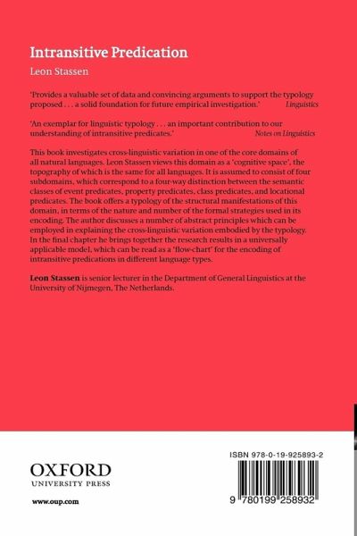 Stassen makes a major contribution to the study of language typology with Intransitive Predication. Basing his analysis on a sample of 410 languages, he presents a universally applicable model for defining the domain of intransitive predication in natural languages. Intransitive predicates are defined in terms of four domains: events (Sarah is walking), classes (Sarah is a secretary), properties (Sarah is tall), and locations (Sarah is in the garden).