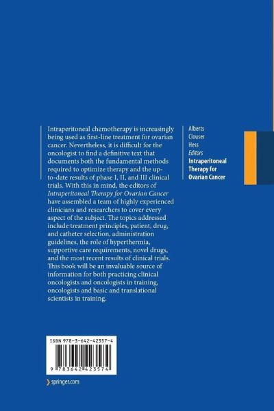 Intraperitoneal chemotherapy is increasingly being used as first-line treatment for ovarian cancer. Nevertheless, it is difficult for the oncologist to find a definitive text that documents both the fundamental methods required to optimize therapy and the up-to-date results of phase I, II, and III clinical trials. With this in mind, the editors of Intraperitoneal Chemotherapy have assembled a team of highly experienced clinicians and researchers to cover every aspect of the subject. The topics addressed include treatment principles, patient, drug, and catheter selection, administration guidelines, the role of hyperthermia, supportive care requirements, novel drugs, and the most recent results of clinical trials. This book will be an invaluable source of information for both practicing clinical oncologists and oncologists in training.