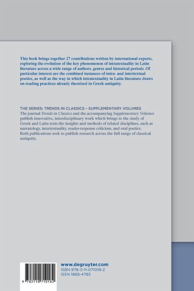 Recent years have witnessed an increased interest in classical studies in the ways meaning is generated through the medium of intertextuality, namely how different texts of the same or different authors communicate and interact with each other. Attention (although on a lesser scale) has also been paid to the manner in which meaning is produced through interaction between various parts of the same text or body of texts within the overall production of a single author, namely intratextuality. Taking off from the seminal volume on Intratextuality: Greek and Roman Textual Relations, edited by A. Sharrock / H. Morales (Oxford 2000), which largely sets the theoretical framework for such internal associations within classical texts, this collective volume brings together twenty-seven contributions, written by an international team of experts, exploring the evolution of intratextuality from Late Republic to Late Antiquity across a wide range of authors, genres and historical periods. Of particular interest are also the combined instances of intra- and intertextual poetics as well as the way in which intratextuality in Latin literature draws on reading practices and critical methods already theorized and operative in Greek antiquity.