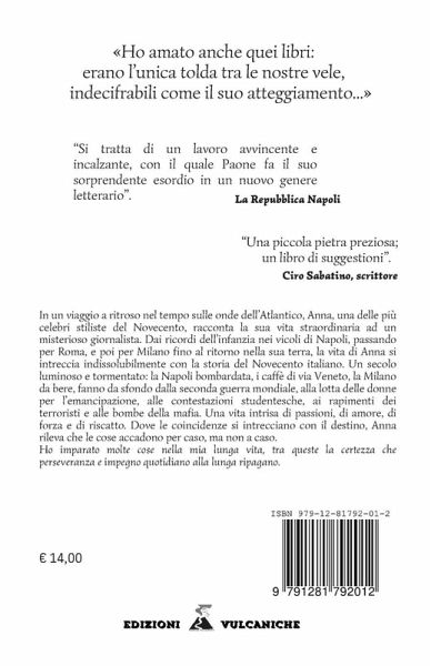 In un viaggio a ritroso nel tempo sulle onde dell'Atlantico. Anna, una delle più celebri stiliste del Novecento, racconta la sua vita straordinaria ad un misterioso giornalista. Dai ricordi dell'infanzia nei vicoli di Napoli, passando per Roma, e poi per Milano fino al ritorno nella sua terra, la vita di Anna si intreccia indissolubilmente con la storia del Novecento italiano. Un secolo luminoso e tormentato: la Napoli bombardata, i caffè di via Veneto, la Milano da bere, fanno da sfondo dalla seconda guerra mondiale, alla lotta delle donne per l'emancipazione, alle contestazioni studentesche, ai rapimenti dei terroristi e alle bombe della mafia. Una vita intrisa di passioni, di amore, di forza e di riscatto. Dove le coincidenze si intrecciano con il destino, Anna rileva che le cose accadono per caso, ma non a caso. Ho imparato molte cose nella mia lunga vita, tra queste la certezza che perseveranza e impegno quotidiano alla lunga ripagano.