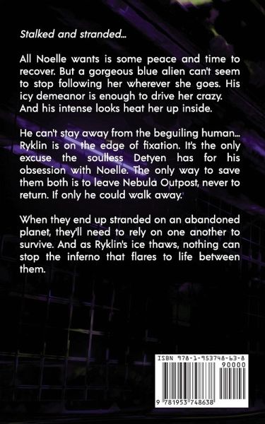 Stalked and stranded... All Noelle wants is some peace and time to recover. But a gorgeous blue alien can't seem to stop following her wherever she goes. His icy demeanor is enough to drive her crazy. And his intense looks heat her up inside. He can't stay away from the beguiling human... Ryklin is on the edge of fixation. It's the only excuse the soulless Detyen has for his obsession with Noelle. The only way to save them both is to leave Nebula Outpost, never to return. If only he could walk away. When they end up stranded on an abandoned planet, they'll need to rely on one another to survive. And as Ryklin's ice thaws, nothing can stop the inferno that flares to life between them.